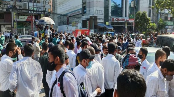 হাফ ভাড়া কার্যকরের দাবিতে ঢাকা কলেজ মূল ফটকের সামনে অবস্থান করেছে ঢাকা কলেজ শিক্ষার্থীরা। বৃহস্পতিবার সকাল ১০টায় প্রথমে কলেজের মূল ফটকে অবস্থান করলেও, পরে রাস্তায় বিক্ষোভ করে শিক্ষার্থীরা। এক ঘণ্টা