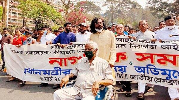 কারাগারে লেখক মুশতাক আহমেদসহ সব হত্যার বিচার, মিথ্যা মামলা-হয়রানি বন্ধ এবং ভিন্নমত ও গণমাধ্যম দমনের ডিজিটাল নিরাপত্তা আইন বাতিলের দাবিতে প্রধানমন্ত্রীর কার্যালয় অভিমুখে এক নাগরিক পদযাত্রা বের হয়েছে। যেখানে শারীরিক