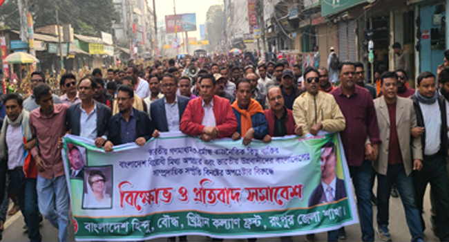 বাংলাদেশে সংখ্যালঘুরা ভালো আছেন মন্তব্য করে বাংলাদেশ হিন্দু বৌদ্ধ খ্রিষ্টান কল্যাণ ফ্রন্টের আয়োজনে ভারতীয় গণমাধ্যমে বাংলাদেশবিরোধী প্রচারণা, হাইকমিশনে হামলা ও পতাকা পোড়ানের প্রতিবাদে এক বিক্ষোভ সমাবেশে বক্তারা বলেছেন, ‘পতিত হাসিনা
