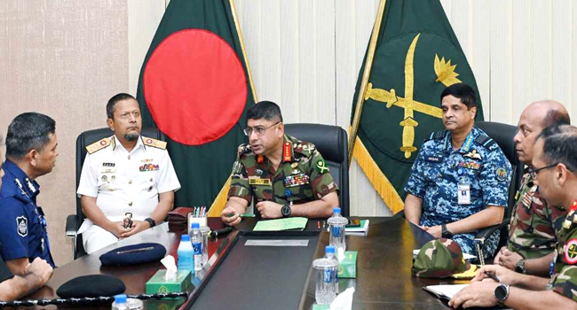 চলমান অরাজকতা, অগ্নি সংযোগ ও ধ্বংসাত্মক কার্যক্রম বন্ধের মাধ্যমে দেশের স্থিতিশীলতা রক্ষায় সশস্ত্র বাহিনীসহ অন্যান্য আইন-শৃঙ্খলা রক্ষাকারী বাহিনীর শক্ত অবস্থান গ্রহণের বিষয়ে বাহিনী প্রধানগণ সিদ্ধান্ত নিয়েছেন। বৃহস্পতিবার সেনাসদরে সেনাবাহিনী প্রধান