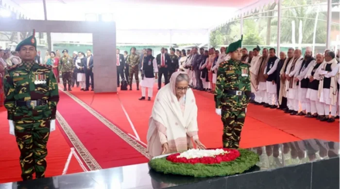 জাতির পিতা বঙ্গবন্ধু শেখ মুজিবুর রহমানের স্বদেশ প্রত্যাবর্তন দিবস উপলক্ষে তার প্রতিকৃতিতে পুষ্পস্তবক অর্পণ করে শ্রদ্ধা জানিয়েছেন প্রধানমন্ত্রী শেখ হাসিনা। আজ বুধবার সকালে ধানমন্ডি ৩২ নম্বরে বঙ্গবন্ধু স্মৃতি জাদুঘরের সামনে