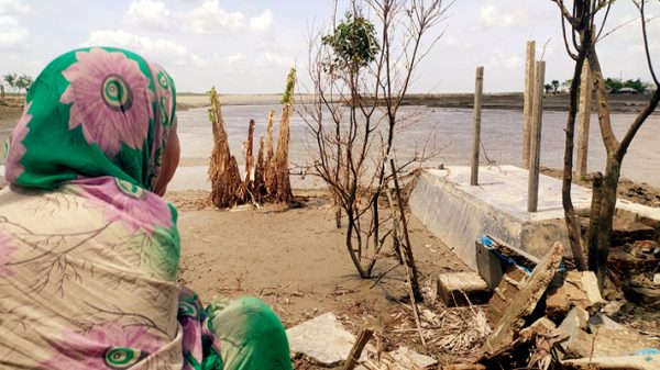 ‘ঘূর্ণিঝড়ের কথা হুনলেই আমরা ডরাই। এইবারের ঝড়ের সময় জোয়ারের ধাক্কায় বেড়িবাঁধ ভাইঙ্গা পানি ভিতরে ঢুইক্কা আমাগো ঘরবাড়ি ডুইব্বা গেছে। ঘরের মইধ্যে যেইটুক খাবার আছিল সবই ভিইজ্যা গেছে। পরে জোয়ার নাইম্মা