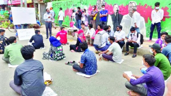 শিক্ষা প্রতিষ্ঠান খোলার দাবিতে রাজশাহীতে চলমান আন্দোলনের অংশ হিসেবে রাজপথেই এবার প্রতীকী ক্লাস ও অবস্থান কর্মসূচি পালন করেছেন শিক্ষার্থীরা। গতকাল বেলা সাড়ে ১১টায় নগরীর সাহেব বাজার জিরো পয়েন্টে এমন কর্মসূচি