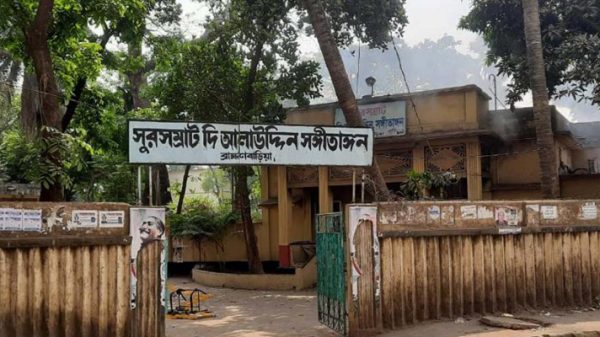 সুরসম্রাট আলাউদ্দিন সংগীতাঙ্গনের সরোদ মঞ্চের পেছনের দিকে খোলা জায়গাজুড়েই গাছপালা। সবুজ পাতার ফাঁকে ফুটে থাকা টকটকে লাল জবা দেখে মনে হবে, যেন চৈত্রের বাতাসে দুলছে বাংলাদেশের পতাকা। প্রকৃতির এমন দৃশ্যপট