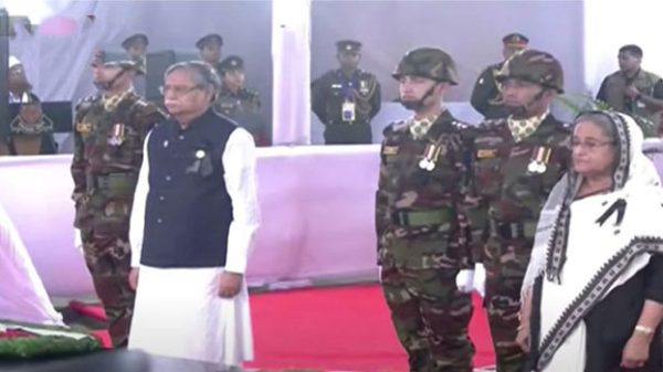 বঙ্গবন্ধু শেখ মুজিবুর রহমানের ৪৮তম শাহাদাতবার্ষিকী ও জাতীয় শোক দিবসে ধানমন্ডির ৩২ নম্বরে বঙ্গবন্ধু শেখ মুজিবুর রহমানের প্রতিকৃতিতে শ্রদ্ধা নিবেদন করেছেন রাষ্ট্রপতি মো. সাহাবুদ্দিন ও প্রধানমন্ত্রী শেখ হাসিনা। মঙ্গলবার (১৫