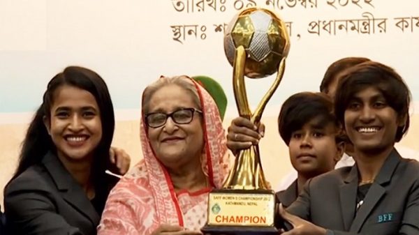 সাফ চ্যাম্পিয়নশিপ জয়ী নারী ফুটবল দলকে সংবর্ধনা দিয়েছেন প্রধানমন্ত্রী শেখ হাসিনা। আজ বুধবার সকাল ১০টায় প্রধানমন্ত্রীর কার্যালয়ের শাপলা হলে এ সংবর্ধনা দেওয়া হয়। সংবর্ধনা অনুষ্ঠানে সাফজয়ী ২৩ জন ফুটবলার ও