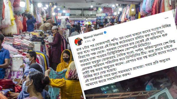 বিদ্যুৎ-জ্বালানি এবং খনিজ সম্পদ প্রতিমন্ত্রী নসরুল হামিদ জানিয়েছেন, রাত ৮টার পর দোকানপাট খোলা থাকলে তাদের বিদ্যুৎ সংযোগ বিচ্ছিন্ন করা হবে। মঙ্গলবার প্রতিমন্ত্রী তার ভেরিফাইড ফেসবুক পেজে এক পোস্টের মাধ্যমে এ