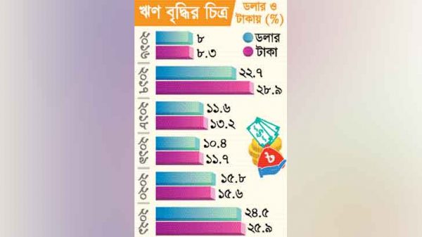 গত বছরের ডিসেম্বর পর্যন্ত দেশের মোট বৈদেশিক ঋণ বেড়ে দাঁড়িয়েছে ৯ হাজার ৭৯ কোটি ডলার। ওই সময়ে টাকার হিসাবে ঋণ ছিল ৭ লাখ ৭৯ হাজার কোটি টাকা। ডিসেম্বরে ডলারের বিপরীতে