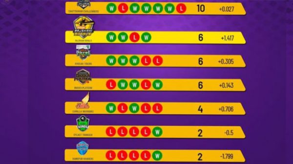 বিপিএলের এবারের আসরের দুটি পর্ব শেষ হয়েছে। আগামীকাল থেকে শুরু হচ্ছে তৃতীয় পর্ব। এর আগে ২০টি ম্যাচ অনুষ্ঠিত হয়েছে। এর মধ্যে ১০ পয়েন্ট নিয়ে শীর্ষে আছে চট্টগ্রাম চ্যালেঞ্জার্স। তারা সাতটি
