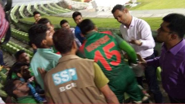 এক দর্শকের বাজে আচরণে হঠাৎ করেই মেজাজ হারান মুশফিক। রেগে গিয়ে গ্যালারিতে ঢুকে ওই দর্শককের মুখোমুখী হন। রোববার প্রস্তুতি ম্যাচে সবুজ দলের বিপক্ষে ৩ বলে ৪ রান করে আউট হয়ে
