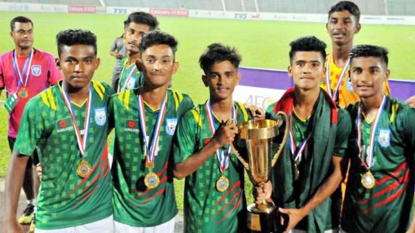 উয়েফার অনূর্ধ্ব-১৬ চ্যাম্পিয়নশিপের আয়োজক হয়েই বাজিমাত করেছে বাংলাদেশের কিশোররা। তিন ম্যাচের তিনটি জিতে অপরাজিত চ্যাম্পিয়ন হয়েছে বাংলাদেশ। বঙ্গবন্ধু জাতীয় স্টেডিয়ামে তৃতীয় ম্যাচে বাংলাদেশ ৬-০ গোলে উড়িয়ে দিয়েছে মালদ্বীপের কিশোরদের। হ্যাটট্রিক