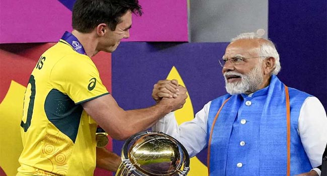নিজের নামের স্টেডিয়ামে তখন দাঁড়িয়ে ভারতের প্রধানমন্ত্রী নরেন্দ্র মোদি। পরনে নীল রঙের জ্যাকেট। সাথে গেরুয়া বর্ডার দেয়া নীল উত্তরীয়। ওই পোশাক পরেই বিশ্বকাপ চ্যাম্পিয়নদের হাতে ট্রফি তুলে দিলেন তিনি। শুধু