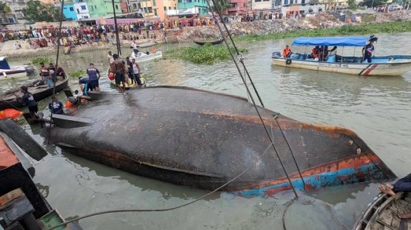 ঢাকার কেরানীগঞ্জে বুড়িগঙ্গা নদীর তৈলঘাটে বাল্কহেডের ধাক্কায় ডুবে যাওয়া ওয়াটার বাসটি উদ্ধার করে তীরে আনা হয়েছে। ডুবে যাওয়ার প্রায় ১২ ঘণ্টা পর বাসটি টেনে তুলল বাংলাদেশ অভ্যন্তরীণ নৌ-পরিবহন কর্তৃপক্ষের (বিআইডব্লিউটিএ)