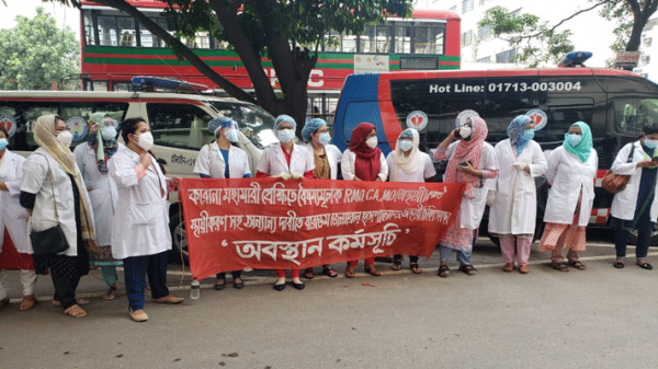 ডিউটি চলাকালীন সময়ে পর্যাপ্ত সুরক্ষা সামগ্রীর অভাব, করোনা টেস্টের ব্যবস্থা না থাকা এবং আক্রান্ত চিকিৎসকদের চিকিৎসার ক্ষেত্রে নানা ভোগান্তির অভিযোগসহ চাকরি স্থায়ীকরণের দাবিতে আজ সোমবারও অবস্থান কর্মসূচি পালন করছেন বারডেম