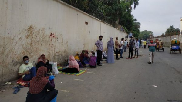 রোববার, সকাল সাড়ে ৭টা। কাকরাইল হয়ে রমনা পার্কের রাস্তা ধরে এগুতেই হোটেল ইন্টার কন্টিনেন্টালের আগেই ফুটপাতে মানুষের লাইন চোখে পড়লো। সবাই মুখে মাস্ক পড়া, নারী ও পুরুষ উভয়ই। কেউ বসে,