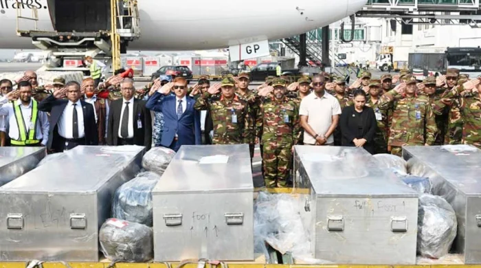 দক্ষিণ সুদানের আবেই সীমান্তে সন্ত্রাসী হামলায় নিহত ছয় বাংলাদেশি শান্তিরক্ষীর মরদেহ দেশে পৌঁছেছে। শনিবার (২০ ডিসেম্বর) সকালে শহীদ শান্তিরক্ষীদের মরদেহ বহনকারী এমিরেটস এয়ারলাইন্সের একটি ফ্লাইট ঢাকার হযরত শাহজালাল আন্তর্জাতিক বিমানবন্দরে