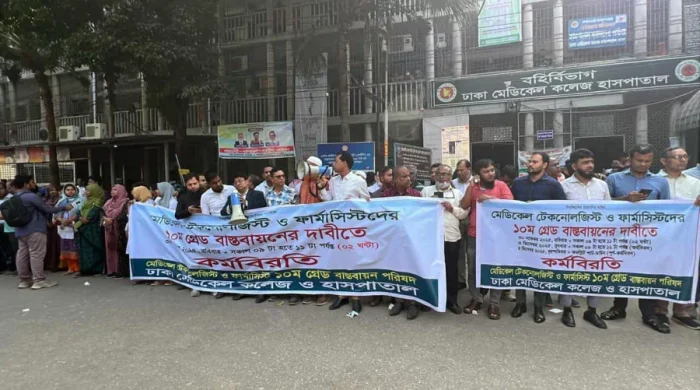 ১১তম গ্রেড থেকে ১০ম গ্রেডে উন্নতীকরণের দাবিতে ঢাকা মেডিকেলে কলেজ হাসপাতালে দুই ঘণ্টা কর্মবিরতি পালন করেছে মেডিকেল টেকনোলজিস্ট ও ফার্মাসিস্টরা। এসময় হাসপাতালে আগত অসংখ্য রোগীকে দুর্ভোগ পোহাতে দেখা যায়। রবিবার