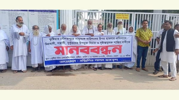 কুষ্টিয়ার দৌলতপুর উপজেলার লাউবাড়িয়াতে সাধুসঙ্গে বাউলদের উপর হামলাবারীদের বিচারের দাবিতে ও প্রতিবাদে মানববন্ধন অনুষ্ঠিত হয়েছে। বাউল সম্রাট লালন ভক্তবৃন্দের আয়োজনে শনিবার সকালে কুমারখালী উপজেলার ছেঁউড়িয়া লালন একাডেমির সামনের সড়কে মানববন্ধন