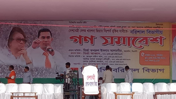 বরিশালের গণসমাবেশ মঞ্চে বিএনপি চেয়ারপারসন বেগম খালেদা জিয়ার জন্য ফাঁকা চেয়ার রাখা হয়েছে। মঞ্চের ঠিক মাঝখানে সাদা তোয়ালে দিয়ে আবৃত একটি ফাঁকা চেয়ার দেখা যায়। চট্টগ্রাম, খুলনা ও ময়মনসিংহের গণসমাবেশেও