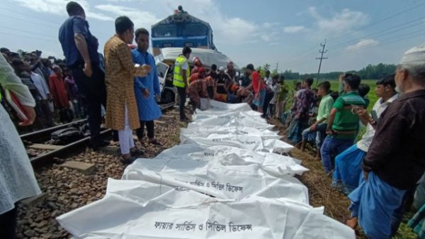 চট্টগ্রামের মিরসরাইয়ে ট্রেন দুর্ঘটনায় নিহত ১১ তরুণের দাফন সম্পন্ন হয়েছে। আজ শনিবার সকাল সাড়ে ১০টায় হাটহাজারী উপজেলার খন্দকিয়া ছমদিয়া বালিকা উচ্চ বিদ্যালয় মাঠে জিয়াউল হক সজীব, ইকবাল হোসেন মারুফ, রিদুয়ানুল