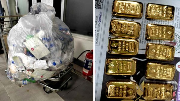 বিমানের একটি ফ্লাইটের আবর্জনার ট্রলিতে পরিত্যক্ত অবস্থায় পাওয়া গেল ১.১৬ কেজি ওজনের ১০টি স্বর্ণের বার। যার বাজারমূল্য ১ কোটি টাকা। মঙ্গলবার (২৬ জুলাই) সকালে সিলেটের ওসমানী আন্তর্জাতিক বিমানবন্দর কাস্টমস কর্তৃপক্ষ