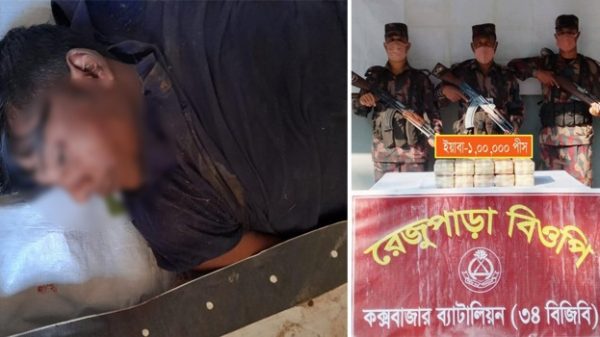 নাইক্ষংছড়ি-মিয়ানমার সীমান্তে কক্সবাজার ৩৪ বিজিবি সদস্যদের সাথে ‘বন্দুকযুদ্ধে’ দুই রোহিঙ্গা নিহত হয়েছেন। ঘটনাস্থল থেকে দুটি দেশীয় তৈরি একনলা বন্দুক, চার রাউন্ড কার্তুজ, দুটি খালি খোসা এবং তিন কোটি টাকা মূল্যের