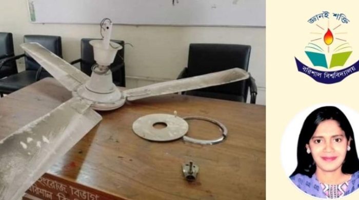 ক্লাস চলাকালীন সিলিং ফ্যান খুলে পড়ে বরিশাল বিশ্ববিদ্যালয়ের (ববি) ইংরেজি বিভাগের সহযোগী অধ্যাপক খাদিজা আক্তার আহত হয়েছেন। শনিবার (২৪ মে) বেলা আড়াইটার দিকে ঘটনাটি ঘটে। তিনি প্রাথমিক চিকিৎসা নিয়েছেন। বিশ্ববিদ্যালয়