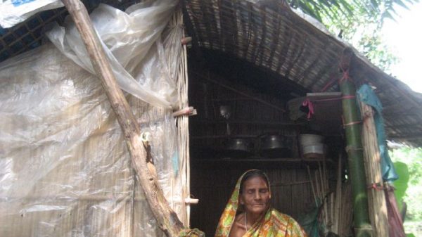 পলিথিনে মোড়ানো কুঁড়ে ঘরটির দরজায় বসে আছেন বৃদ্ধা আয়শা। ওই দরজা দিয়েই দেখা যাচ্ছে, কী করুণ অবস্থা এই বিধবার! শেষ বয়সে থাকার মত একটি ঘরও নেই তার। তাই আবদার করেছেন