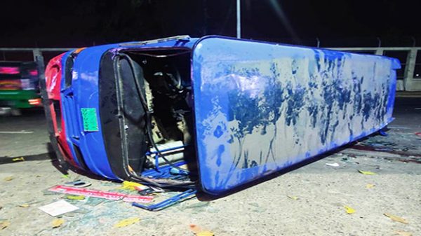 চট্টগ্রাম মহানগরী ইপিজেড থানা নিউমুরিং রেলক্রসিংয়ে তেলবাহী ওয়াগন ট্রেনেকে ধাক্কা দিয়ে বাস উল্টে গেলে এক রেল কর্মীসহ তিনজন নিহত হয়েছেন। সোমবার রাত সাড়ে ৯টায় এ দুর্ঘটনা ঘটে। নিহতরা হলেন- রেলের