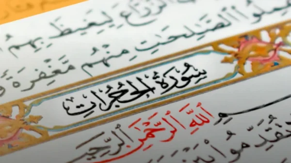 সুরা হুজুরাত। যাকে বলা হয় আদব বা আদবের সুরা। এ সুরাটি আদব শেখায়। যা নাজিল হওয়ার পর সাহাবিরা ভীত হয়ে পড়েছিলেন। কারণ এই সুরায় আল্লাহ বললেন, ‘হে বিশ্বাসীগণ, তোমরা নবীর