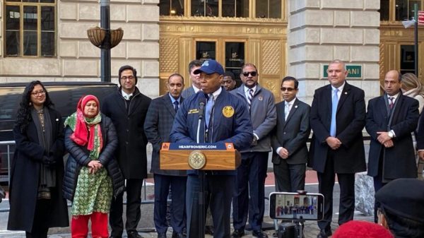 নিউইয়র্ক সিটি মেয়র এরিক আডাম বাংলাদেশের স্বাধীনতা দিবস উপলক্ষে নিউইয়র্ক শহরের প্রানকেন্দ্র ব্রডওয়ে ওয়াইটহলের চ্যারিস বুলক চত্তরে উৎসবমূখর পরিবেশে বাংলাদেশের কন্স্যুলেট জেনারেল ড.মনিরুল ইসলামের উপস্থিতে নিউইয়র্কে বসবাসরত বীরমুক্তিযোদ্ধাবৃন্দ ও বিশিষ্ট