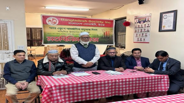 নিউইয়র্কে অমর একুশে আর্ন্তজাতিক মাতৃভাষা দিবস পালন উপলক্ষ্যে বাংলাদেশ সোসাইটি ২৯ জানুয়ারি রোববার কমিউনিটির বিভিন্ন সংগঠনের নেতৃবৃন্দের সাথে এক মতবিনিময় সভা করেছে। এলমহার্স্টস্থ সংগঠনের কার্যালয়ে অনুষ্ঠিত সভায় সভাপতিত্ব করেন সভাপতি