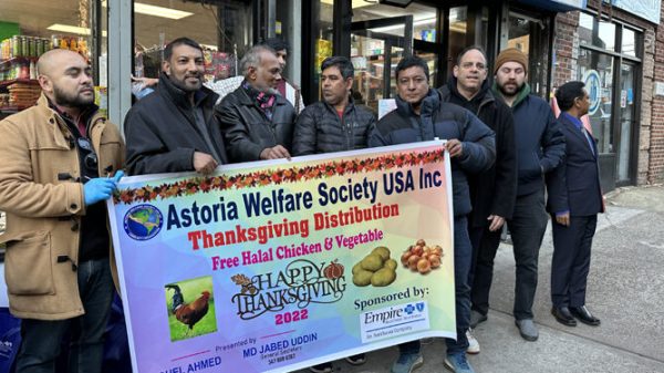 যুক্তরাষ্ট্রের নিউইয়র্কে থ্যাংকস গিভিং ডে উপলক্ষ্যে এস্টোরিয়া ওয়েলফেয়ার সোসাইটির উদ্যোগে আবারো হালাল চিকেন বিতরণ করা হয়েছে।স্থানীয় সময় বুধবার (২৩ নভেম্বর) এস্টোরিয়া এলাকায় সাড়ে তিন শতাধিক মানুষের মাঝে হালাল চিকেন বিতরণ
