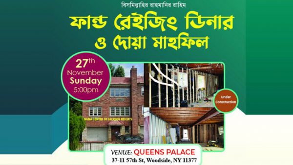 মুনা সেন্টার অব জ্যাকসন হাইটস এর উদ্যোগে নিউইয়র্কের উডসাইডে ফান্ড রেইজিং ডিনার ও দোয়া মাহফিলের আয়োজন করা হয়েছে। নিউইয়র্কের কুইন্স প্যালেসে স্থানীয় সময় রবিবার (২৭ নভেম্বর) বিকেল ৫ টায় এই