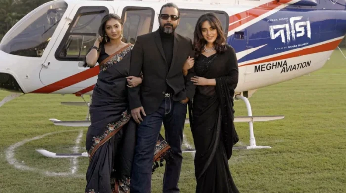 চোখে কালো সানগ্লাস, ঝুঁটি বাঁধা চুল, পরনে কালো ব্লেজার- এটা আফরান নিশোর বেশভূষা। আর এলেন উড়ে, হেলিকপ্টারে। সঙ্গে দুই নায়িকা তমা মির্জা ও সুনেরাহ বিনতে কামাল। গতকাল রবিবার নায়কের জন্মদিনে
