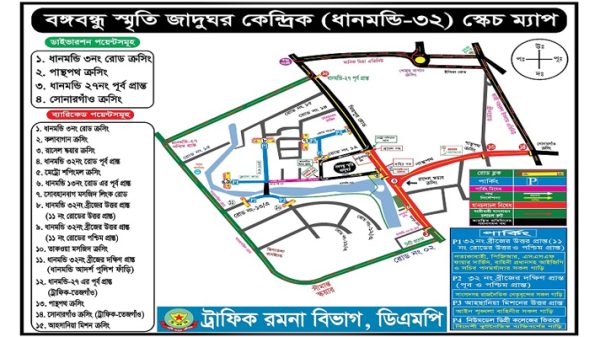 ৫ আগস্ট জাতির পিতা বঙ্গবন্ধু শেখ মুজিবুর রহমানের ৪৮তম শাহাদাত বার্ষিকী এবং জাতীয় শোক দিবস যথাযথ রাষ্ট্রীয় মর্যাদায় উদযাপনের লক্ষ্যে ঢাকা মহানগর পুলিশের (ডিএমপি) পক্ষ থেকে ট্রাফিক নির্দেশনা জারি করা