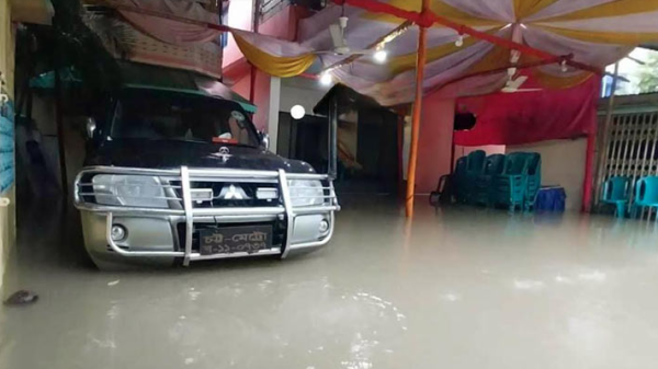 বৃষ্টির পানিতে ডুবেছে চট্টগ্রাম নগরীর বেশ কিছু এলাকা। পানি ঢুকেছে চট্টগ্রাম সিটি করপোরেশনের (চসিক) মেয়র রেজাউল করিম চৌধুরীর বাড়িতেও। তার বাসার সামনের সড়কে হাঁটু সমান পানি। বৃহস্পতিবার মধ্যরাত থেকে নগরীতে