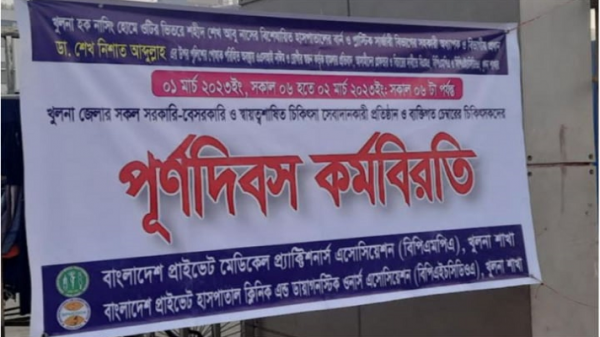 চিকিৎসকের ওপর হামলার প্রতিবাদে খুলনার সরকারি-বেসরকারি সব হাসপাতাল ও ক্লিনিকে দ্বিতীয় দিনের মতো চিকিৎসকদের পূর্ণদিবস কর্মবিরতি চলছে। তবে খোলা রয়েছে হাসপাতালের জরুরি বিভাগ। গতকাল বুধবার রাতে নগরীর সাতরাস্তা মোড়ের বিএমএ