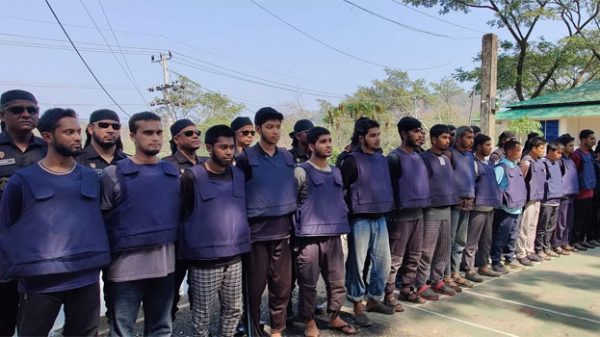 বান্দরবানে র্যাবের অভিযানে গ্রেফতার হওয়া জামাতুল আনসার ফিল হিন্দাল শারক্বীয়ার ১৭ সদস্য ও কেএনএফ-এর তিন সদস্যকে বান্দরবান র্যাব কার্যালয়ে নিয়ে আসা হয়েছে। এদের কাছ থেকে উদ্ধার করা হয়েছে দুটি একে-৪৭