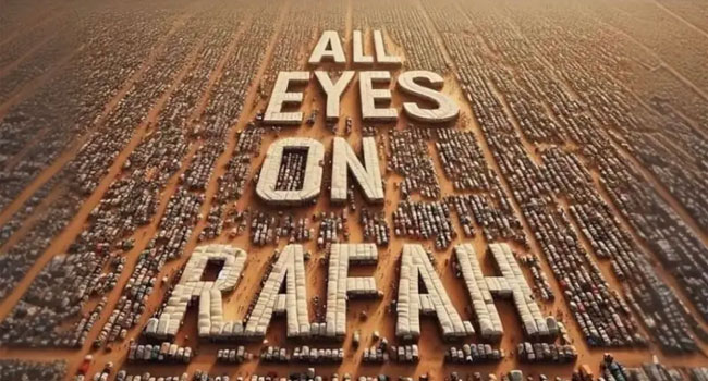 বিরাট এলাকাজুড়ে উচ্ছেদ হওয়া ফিলিস্তিনি শরণার্থীদের তাঁবু আর একটি স্লোগান যাতে লেখা ‘অল আয়েস অন রাফা’ বা ‘সবার চোখ এখন রাফায়’, কৃত্রিম বুদ্ধিমত্তার দ্বারা তৈরি এই ছবিটি সামাজিক যোগাযোগমাধ্যমে এখন