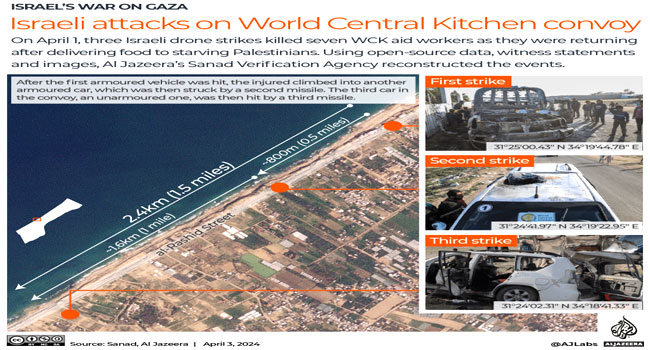 ইসরাইলি বিমান হামলায় ত্রাণ সংস্থা ওয়ার্ল্ড সেন্ট্রাল কিচেনের (ডব্লিউসিকে) সাত কর্মী নিহত হওয়ায় দিনেই মার্কিন যুক্তরাষ্ট্র ইসরাইলকে আরো অস্ত্র অনুমোদন করেছে। বৃহস্পতিবার কাতারভিত্তিক সংবাদমাধ্যম আল-জাজিরার এক প্রতিবেদনে এ তথ্য জানানো