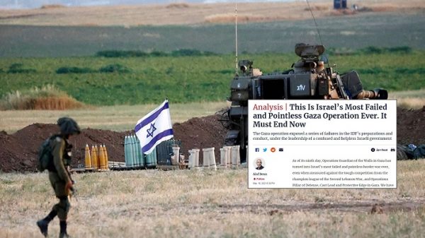 গাজায় ফিলিস্তিনি যোদ্ধাদের বিরুদ্ধে ইসরায়েলের সব পরিকল্পনাই ব্যর্থ হয়েছে বলে মন্তব্য করেছে ইসরায়েলি সংবাদপত্র হারেৎজ। পত্রিকাটির প্রধান সম্পাদক আলুফ বেন এক বিশ্লেষণে বলেন, এই যুদ্ধ এখনই বন্ধ করতে হবে। এ