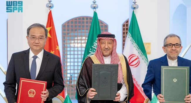 সৌদি আরব ও ইরান বেইজিং চুক্তি পুরোপুরি বাস্তবায়নে তাদের প্রতিশ্রুতি পুনঃব্যক্ত এবং জাতিসঙ্ঘ সনদের আলোকে প্রতিবেশীসুলভ সম্পর্ক জোরদার করার প্রতিশ্রুতি দিয়েছে। মঙ্গলবার রিয়াদে অনুষ্ঠিত বেইজিং চুক্তি বাস্তবায়নে সৌদি-চীন-ইরান যৌথ ত্রিপক্ষীয়