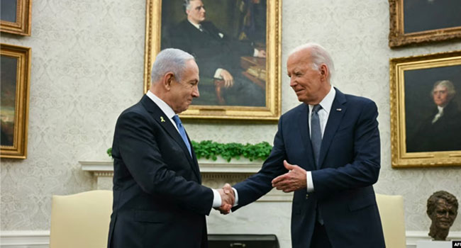 যুক্তরাষ্ট্রের প্রেসিডেন্ট জো বাইডেন গাজায় যুদ্ধবিরতি এবং হামাসের হাতে আটক পণবন্দীদের মুক্তি নিয়ে আলোচনার জন্য বৃহস্পতিবার হোয়াইট হাউসে ইসরাইলি প্রধানমন্ত্রী বেনিয়ামিন নেতানিয়াহুর সাথে বৈঠক করেছেন। দু’নেতাই গুরুত্বপূর্ণ ভাষণ দেয়ার পরের