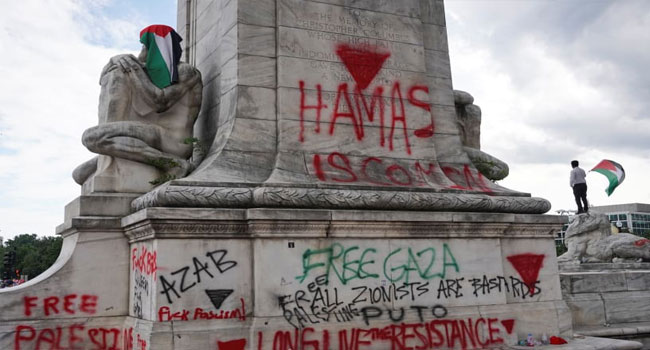 ‘হামাস আসছে’- এমন বক্তব্য লেখা হলো ওয়াশিংটন ডিসির বিশেষ পরিচিতি স্মারক ক্রিস্টোফার কলম্বাস মেমোরিয়াল ফাউন্টেনে। ইসরাইলি প্রধানমন্ত্রী বেনিয়ামিন নেতানিয়াহুর বুধবার মার্কিন কংগ্রেস বক্তৃতা প্রতিবাদে ফিলিস্তিনপন্থী বিক্ষোভকারীরা এ কাজ করে বলে