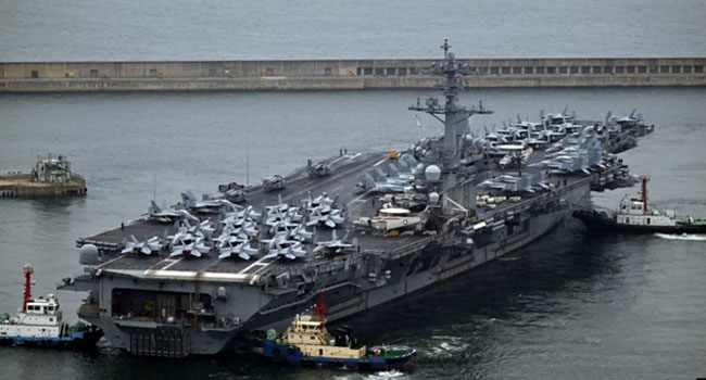 যুক্তরাষ্ট্রের পারমাণবিক শক্তিচালিত একটি বিমানবাহী রণতরী শনিবার দক্ষিণ কোরিয়ায় ত্রিমুখী মহড়ার জন্য পৌঁছেছে। এটি রাশিয়ার সাথে সম্পৃক্ত হবার কারণে উত্তর কোরিয়ার ক্রমবর্ধমান হুমকি মোকাবেলা করতে তাদের সামরিক প্রশিক্ষণ প্রসার করার