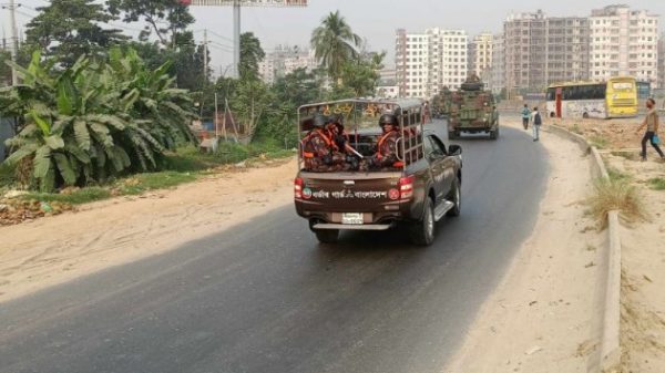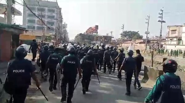 গাজীপুর মহানগরের নাওজোর, ইসলামপুর, ভোগড়া বাইপাস ও এর আশপাশের এলাকার শ্রমিকরা বেতন বাড়ানো দাবিতে বিক্ষোভ করছেন। এ সময় শ্রমিকরা মহাসড়ক অবরোধের চেষ্টা করলে পুলিশ সাউন্ড গ্রেনেড ও টিয়ারশেল ছুড়ে মহাসড়ক