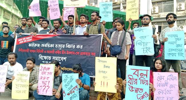 ফেসবুকে পোস্ট দিয়ে জগন্নাথ বিশ্ববিদ্যালয় শিক্ষার্থী ফাইরুজ অবন্তিকার আত্মহত্যার ঘটনায় সুষ্ঠু বিচার ও অভিযুক্তদের গ্রেফতারসহ ছয়দফা দাবিতে বিক্ষোভ মিছিল করেছে শিক্ষার্থীরা। শনিবার (১৬ মার্চ) বিকেল সাড়ে ৩টায়‘নিপীড়নের বিরুদ্ধে জগন্নাথ বিশ্ববিদ্যালয়’