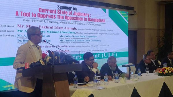 আইনজীবীদের উদ্দেশ্যে বিএনপি মহাসচিব মির্জা ফখরুল ইসলাম আলমগীর বলেছেন, ‘এই সরকারের বিরুদ্ধে রুখে দাঁড়ান, জনগণ আপনাদের সাথে আছে। ইনশাআল্লাহ আমরা জয়ী হবই।’ এ সময় তিনি অভিযোগ করেন যে বর্তমান বিচার