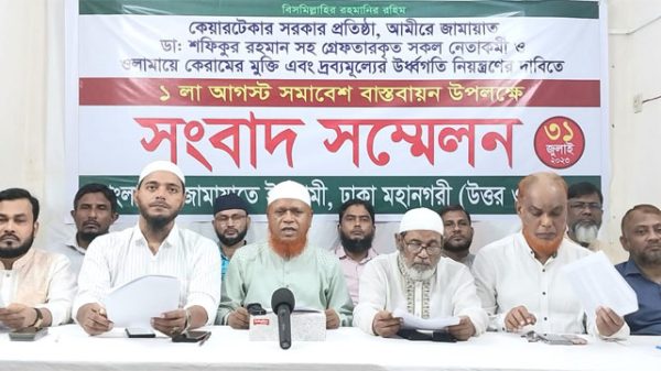 কেয়ারটেকার সরকার-ব্যবস্থা প্রতিষ্ঠা, আমিরে জামায়াত ডা. শফিকুর রহমানসহ গ্রেফতার সকল নেতাকর্মী ও আলেম-ওলামাদের মুক্তি এবং দ্রব্যমূল্যের ঊর্ধ্বগতি নিয়ন্ত্রণের দাবিতে আগামীকাল মঙ্গলবারের (১ আগস্ট) সমাবেশ বাস্তবায়নের লক্ষ্যে সংবাদ সম্মেলন করেছে বাংলাদেশ